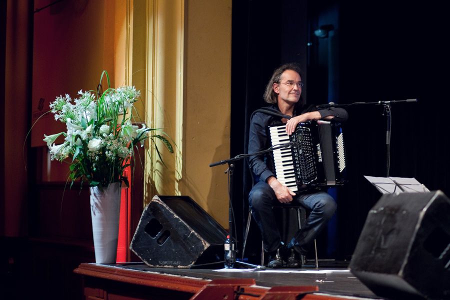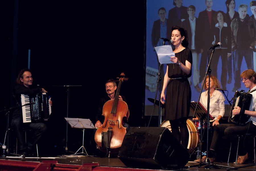 Die nachfolgende knappe Stunde des Abends überzeugte das gesamte anwesende Publikum sogleich davon, dass die Kulturkommission mit den auftretenden Künstlerinnen und Künstlern ein grossartige Wahl getroffen hatte: «Bern ist überall» zog das Publikum vom ersten Ton an in ihren Bann. Das Ensemble wird denn auch treffend als erste Band der Schweizer Literaturgeschichte tituliert. Dafür sorgt das ausgebuffte Quartett mit Adi Blum, Christian Brantschen, Michael Pfeuti und Maru Rieben an zwei Akkordeons, Cello und Schlagzeug, welches die expressiven Lesungen der elf Literatinnen und Literaten erst zum theatralischen Erlebnis macht. Und die sich überstürzenden Reden, Ausbrüche, Litaneien und Nörgeleien, auf berndeutsch, französisch oder in anverwandten Dialekten wuchsen sich zu einer bodenständigen Sprachsymphonie aus. Das stündige Set erntete stürmischen Applaus.