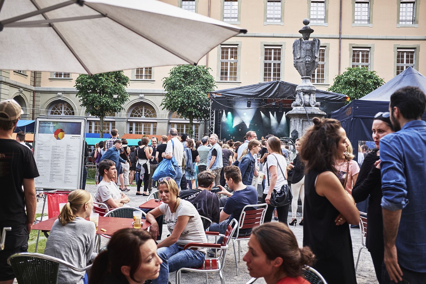 Das Spittelfest 2015 dauerte sieben Tage und gipfelte am Wochenende in einem rauschenden Finale. Doch schon während der ersten Wochenhälfte gab es Höhepunkte. So tourte der Berner GenerationenChor unter Leitung von Patrick Secchiari jeweils in den Abendstunden auf «musikalischen Rundgängen» durch das Burgerspital. Das Publikum kam hierbei neben vokalen Preziosen auch in den Genuss seltener Einblicke in das Gebäude. Für einen gelungenen Festauftakt sorgten weitere Veranstaltungen wie das allmorgendlich geöffnete Ostside-Café, der Gesundheitscheck beim Schweizerischen Roten Kreuz oder Ballspielturniere im Hof.